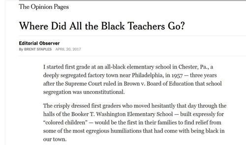 …States and localities with significant black populations are beginning to recognize the whiteness of the teacher corps as an obstacle to student achievement. At the same time, statistics show that districts are doing a miserable job of retaining teachers of color and that more leave the field each year than enter it. A 2016 report by the Education Trust shows why. Among other things, African-Americans interested in teaching black students find they are steered into positions where they teach only black students. The same teachers complain of being pigeonholed as disciplinarians, their other talents rendered invisible.