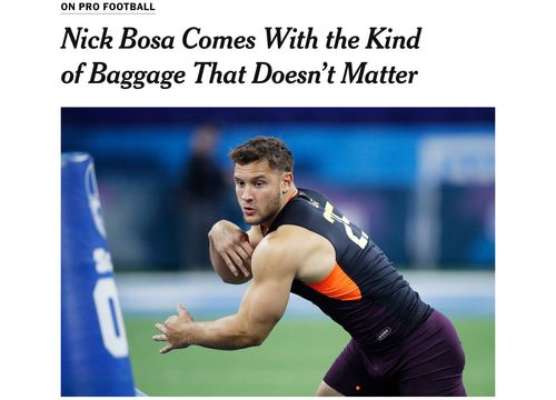 [Nick] Bosa, 21, a talented [white] pass-rusher out of Ohio State, recently deleted several tweets about political and racial subjects. Asked why he had done so, he told ESPN it was in his interest to scrub his social media accounts. “There is a chance I might end up in San Francisco,” he said.