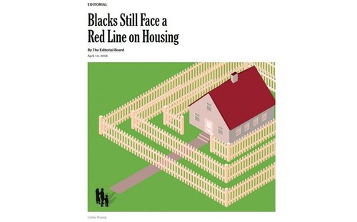 It’s a white house surrounded by white picket fences. And it has a red roof to show it’s been redlined.