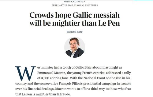Westminster had a touch of Gallic Blair about it last night as Emmanuel Macron, the young French centrist, addressed a rally of 3,500 adoring fans. … “Don’t boo or hiss at my rallies,” he said. “That is for people without hope.”