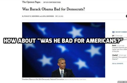 Was Barack Obama Bad for Democrats?Right. While Barack Obama’s rhetoric tried to appear inclusive, his policies and his personality got across the strong impression that he wasn’t on your side if you weren’t an official Victim-American, such as, most conclusively, his second term infatuation with the Transgendered. If you were just a regular American-American, well, sorry, Obama always seemed to imply, but you had your turn and the future belongs to us.By STANLEY B. GREENBERG and ANNA GREENBERG DEC. 23, 2016