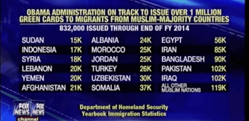Obama Administration on Pace to Issue One Million Green Cards to Migrants from Majority-Muslim Countries, Breitbart.com, June 17 2016The Obama Administration is on pace to issue more than a million green cards to migrants from majority-Muslim countries, according to an analysis of Department of Homeland Security data.