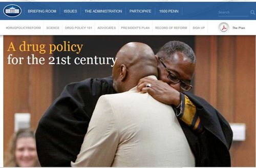 The background image (a black "drug court" Judge hugging a black dealer) from the official White House web page on Drug Policy Reform.We got an angry Facebook message from someone who'd clicked on the link asking if we could actually prove that the huggee was a dealer. (The story doesn't specify.)