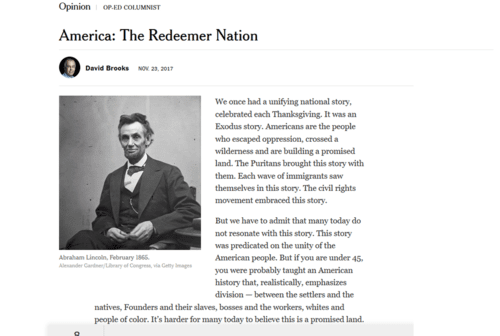 America: The Redeemer NationReading the columns of David Brooks, Bret “I have always thought of the United States as a country that belongs first to its newcomers” Stephens, and Roger Cohen, I now realize we should have a national holiday celebrating the immigration of their ancestors to the United States.David Brooks NOV. 23, 2017