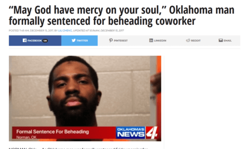 “May God have mercy on your soul,” Oklahoma man formally sentenced for beheading coworker, KFOR.com, December 15, 2017NORMAN, Okla. — An Oklahoma man was formally sentenced Friday morning for beheading a coworker at a food plant.