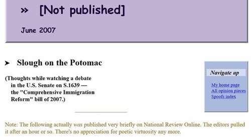 Shucking off false modesty, I'd like to offer my own 2007 effort "Slough on the Potomac" for consideration by the editors of the anthology.