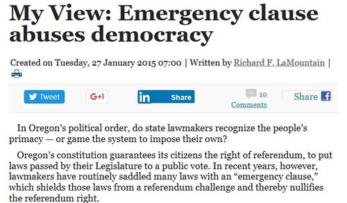 “Seventy-one percent of the bills enacted into law during the 2012 session,” writes [State Senator Sen. Doug Whitsett, R-Klamath Falls], “had an emergency clause attached that [made] them effective immediately upon their passage.” The clause’s frequent intent? Whitsett contends: “To block the constitutionally guaranteed right of the people to refer the new law.” [My View: Emergency clause abuses democracy, by Richard LaMountain]And at least one prominent Oregon Democrat has noticed the promiscuous use of emergency clauses. State Senator Betsy Johnson, from Scappoose, in a Daily Astorian op-ed on—"Scappoose"?!?!—May 21, 2015, wrote: