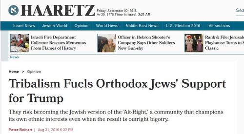 Tribalism Fuels Orthodox Jews’ Support for TrumpObviously, Jews, being naive newcomers to organizing politically, must be taking lessons from those ancient masters of the game, the ‘Alt-Right.’They risk becoming the Jewish version of the ‘Alt-Right,’ a community that champions its own ethnic interests even when the result is outright bigotry.