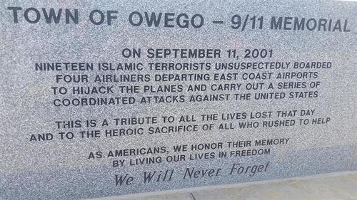 Robert Spencer here for JihadWatch, a program of the David Horowitz Freedom Center and for the Center for Security Policy with new information about that ever deadly pestilence Islamophobia. Islamophobia, according to the mainstream media, is running rampant in the hitherto bucolic town of Owego, New York, and Muslims are worried. Are marauding bands of right-wing extremists pulling hijabs off little old Muslim ladies and daubing swastikas on the walls of mosques?No, the Islamophobia in question appears on Owego’s new 9/11 memorial monument which dares to refer to the perpetrators of the September 11th 2001 jihad terror attacks as “Islamic terrorists.” In this age of Obama, Owego should have known better.