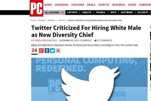 "Not saying a white guy can't be head of diversity but for a company that hires a majority white guys it sends the wrong message," Luckie wrote on TwitterTuesday. "I'm sure he's a great guy but you've set the company back instead of moving it forward." [Twitter Criticized For Hiring White Male as New Diversity Chief by Angela Moscaritolo; PC Magazine; December 30th, 2015.]