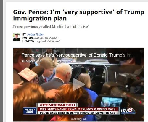 As is the custom when it is time for a Republican to start rebuilding his image, Governor Pence was recently "Hannitized" [Palin to be Hannitized, by Dave Weigel, Slate, January 13, 2011]. He appeared on the Sean Hannity show to show his recently discovered support for Trump's ban on immigration.