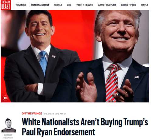 “It’s a boringly conventional move—but I just don’t think it will work, because it’s increasingly obvious that the Donorists will sink the ship rather than let a Nationalist candidate win,” said Peter Brimelow, the editor of VDare.com, a site that often argues for a moratorium on immigration to the United States. “And that goes for their subsidized Conservatism Inc. sock puppets like National Review and Red State, too. Trump already gave them [running mate Mike] Pence, who is a weak fool, and he let [Ted] Cruz speak even though he knew he wouldn’t endorse him. It’s got him nothing.”