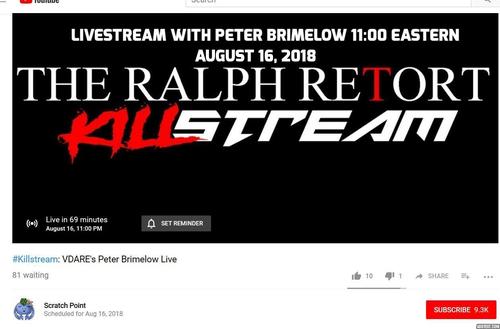 VDARE.com editor Peter Brimelow will be a livestream with The Ralph Retort at 11:00 PM Eastern.