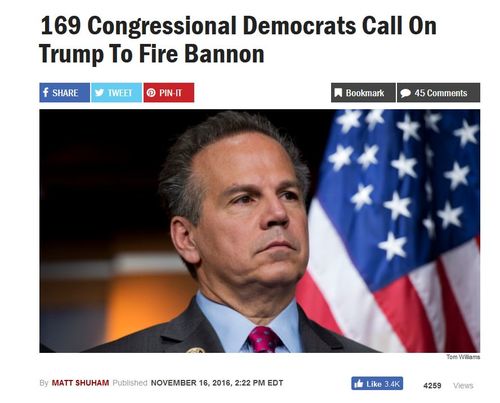 Have you had private conversations with Bannon?The whole thing is nonsense, especially the part where the Congressional Democrats say they believe it should concern Trump that "civil rights groups" including "the Anti-Defamation League and the Southern Poverty Law Center, are widely opposed to Mr. Bannon’s appointment."Met him for the first time last month, we talked for about 30 seconds. I told him he’d done a great job at Breitbart and he agreed.