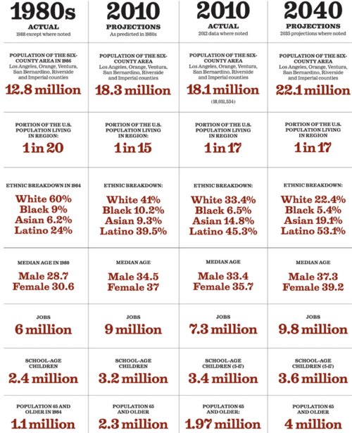 - The ethnic breakdown of 2010: the 1988 planners figured the historic American races of whites and blacks would still be 51% by 2010, but they turned out to be 39.9%. The 1988 planners missed that blacks would be squeezed out of Southern California by high prices. They also badly underestimated the Asian influx, while only moderately underestimating the Hispanic influx.