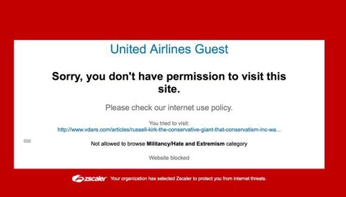 VDARE is unquestionably controversial, and perhaps nativist, but by no means should it be classified as a “Militancy/Hate and Extremist” website. Seriously—a site that runs a review of a university press-published biography is blocked? I wonder what other right-of-center websites are blocked by United?also noting