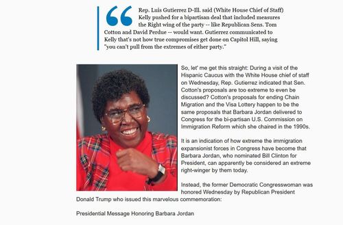 [Senator] Cotton's proposals for ending Chain Migration and the Visa Lottery happen to be the same proposals that Barbara Jordan delivered to Congress for the bi-partisan U.S. Commission on Immigration Reform which she chaired in the 1990s.It is an indication of how extreme the immigration expansionist forces in Congress have become that Barbara Jordan, who nominated Bill Clinton for President, can apparently be considered an extreme right-winger by them today.