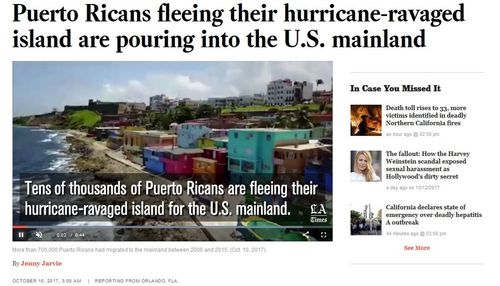 Puerto Ricans fleeing their hurricane-ravaged island are pouring into the U.S. mainland,Los Angeles Times, October 10, 2017