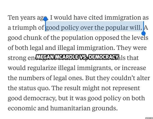 [T]he post-1965 de-Europeanization of America is happening against the will of the American people. It is happening as a result of immigration laws which were passed through deceit and on which serious national debate has been systematically and ruthlessly suppressed.And regarding "popular" ... well, presumably because of the ruthless and systematic suppression that Larry called out, McArdle clearly lacks the domain knowledge that immigration is overwhelmingly unpopular with American citizens, as I wrote here last summer: Americans Don’t Know Much About Immigration, But Know What They Want: The ZERO OPTION! (Or…Less?).[page number 39 in the PDF version; emphasis added]