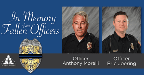Westerville Police Chief Joe Morbitzer said officer Eric Joering, 39, died at the scene and his colleague, Anthony Morelli, 54, died at a local hospital.