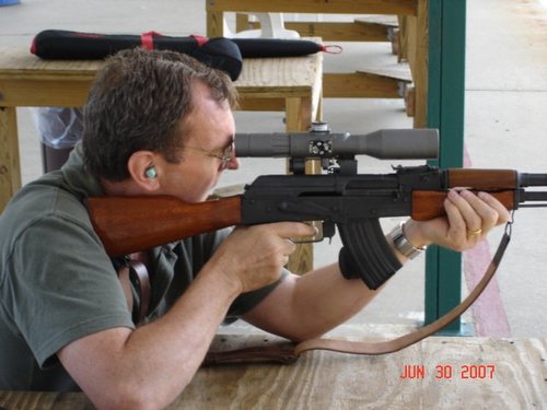 Here I am shooting a friend's AK-47 at a range in New Jersey in June 2007. Not very good gun discipline here. With my eye that close to the scope I should be just sighting up, unless I want to have my eye punched out; but if I'm just sighting up, why is my finger off the trigger guard? Hmm. My excuse is, I am not used to scopes.Scopes? Damned un-gentlemanly contrivances!