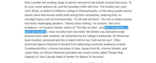 This is in a longish article about free speech on college campuses. The writer — anonymous again: The Economist mostly doesn't run bylines — brings up the speaker cancellations at Williams College in Massachusetts. Edited quote: