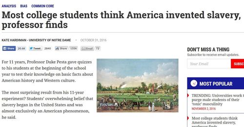 In related news, here's a chap named Duke Pesta, currently an associate professor of English at the University of Wisconsin, Oshkosh. Every year at the beginning of the school year Prof Pesta gives quizzes to his students to test their knowledge on basic facts about American history and Western culture.He declares that students overwhelmingly believe that slavery was a phenomenon exclusive to the United States. Quote from him: "Most of my students could not tell me anything meaningful about slavery outside of America," end quote. It goes without saying that they know nothing about the history of communism, either.