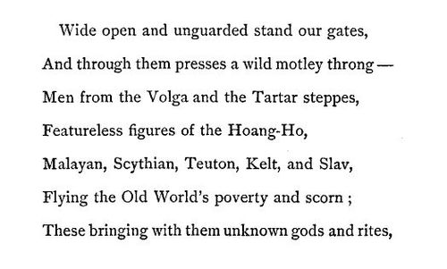 No reference to "The New Colossus" should be left standing alone without some counter-reference to Thomas Bailey Aldrich's poem "Wide and Unguarded Stand Our Gates," written a dozen years later. It's too long to quote in full, but here's the closing stanza, quote: