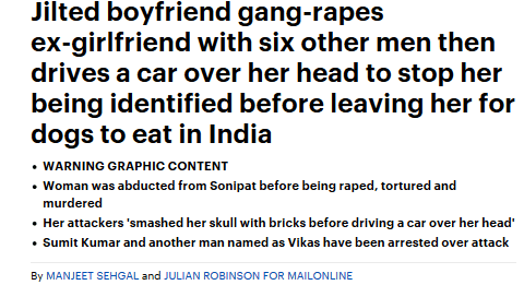 Following up on last week's segment on India, I've been paying attention to news stories from that subcontinent. I must say, they have some really eye-catching crime stories.Here's an exceptionally gruesome one from last week. I'll just give you the headline. It's long, but you need it all for the full effect. Headline: Jilted boyfriend gang-rapes ex-girlfriend with six other men then drives a car over her head to stop her being identified before leaving her for dogs to eat in India. Now that's a headline you can savor.