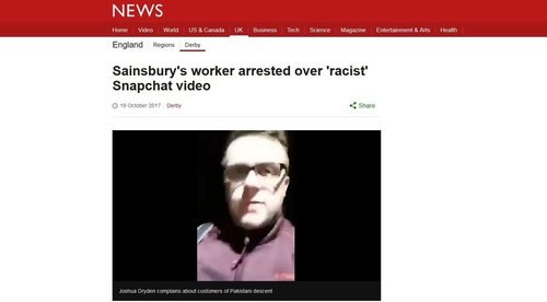 The news is, that a supermarket worker in Derby, a white Englishman name of Joshua Dryden, twenty years old, let loose in a video on Snapchat about how much he dislikes Pakistanis. We know he’s a supermarket worker because he’s wearing the store’s uniform in this video.