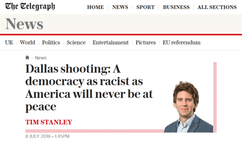 No, these fools have no shame, no self-knowledge. Here's Tim Stanley, honking away self-righteously in the Telegraph, July 8th. Headline: A democracy as racist as America will never be at peace. Sample honk: