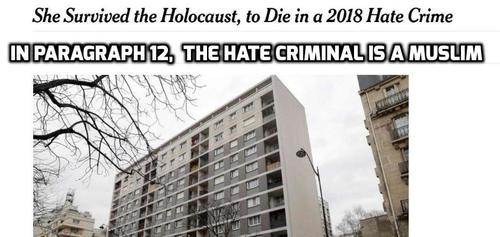 PARIS — An 85-year-old woman who as a child narrowly escaped France’s most notorious wartime roundup of Jews has been murdered in Paris, and the authorities are calling it a hate crime.Okay, so in the 12th paragraph, the Times finally deigns to reveal that the “principal suspect was of North African origin” — in other words, he was a Muslim.The body of the woman, Mireille Knoll, was found on Friday in her apartment in the city’s working-class 11th arrondissement. She had been stabbed to death, and her body was partly burned after her attackers apparently tried to set fire to the apartment.