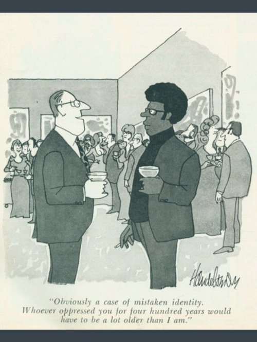 "Obviously a case of mistaken identity. Whoever oppressed you for 400 years would have to be a lot older than I am." I think the white guy was supposed to be the butt of this joke, but the point is well taken.