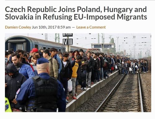Czech Republic Joins Poland, Hungary and Slovakia in Refusing EU-Imposed Migrants, Gateway Pundit, June 10, 2017Naturally, no good deed goes unpunished by authoritarian multiculturalists, and EU honchos mean to smack down any resistance against their toxic diversity scheme, as noted by the Guardian (6/13): EU takes action against eastern states for refusing to take refugees. Brussels is bringing a court case against Poland, Hungary and Czech Republic, and what’s the worst it could do? Demand fines? If a worsened argument hastens a further breakup of the European Union, that would be an excellent outcome for all.The Czech Republic has joined its Central European neighbors in officially announcing a withdrawal from the European Union’s 2015 migrant resettlement program.