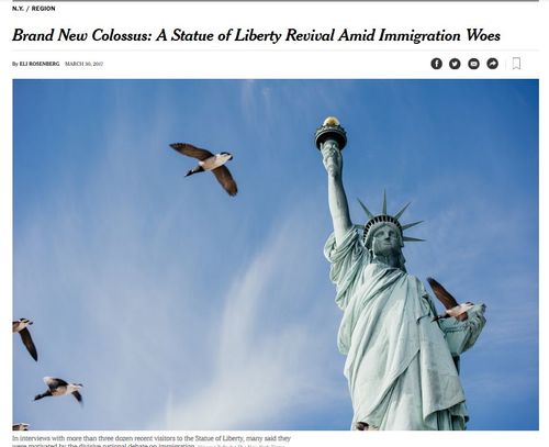 Brand New Colossus: A Statue of Liberty Revival Amid Immigration Woes By ELI ROSENBERG MARCH 30, 2017In other words, the retconning of the Statue of Liberty into the Statue of Immigration is a racist insult to African-Americans, a hijacking by non-blacks of their ancestors’ suffering.In another telling sign of how the last presidential election may have shifted the civic landscape, the Statue of Liberty has re-emerged as a potent and resonant symbol amid a polarizing debate about immigration. …