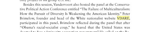 "Besides this session, Vandervoort also hosted the panel at the Conservative Political Action Conference entitled "The Failure of Multiculturalism: How the Pursuit of Diversity Is Weakening the American Identity." Peter Brimelow, founder and head of the White nationalist website VDARE, participated in this panel. Brimelow reflected during the panel that after "Obama's racial-socialist coup," he feared that the United States was doomed to face a "minority occupation government." He called on the Republican Party to focus on becoming the party of white voters by attacking "ethnic lobbies," affirmative action, bilingual education, and "taxpayer subsidies to illegal aliens." Earlier in the session, Vandervoort delivered a rambling presentation from Serge Trifkovic (a conservative commentator who was unable to attend the conference). This paper focused on how the "cult of non-white, non-male, non-heterosexual victimhood" and "multiculturalist indoctrination" was ruining the West and predicted that "the native Western majorities will melt away." [Emphasis added]