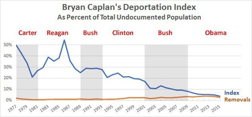 Using Open Borders fanatic Bryan Caplan's estimate of a "return" (migrants who go home under threat of deportation) as counting for 85% of a full blown "removal" (you are forcibly sent home and face jail time if you return and are caught), Kevin Drum provides an interesting way of looking how our recent presidents handled immigration enforcement.