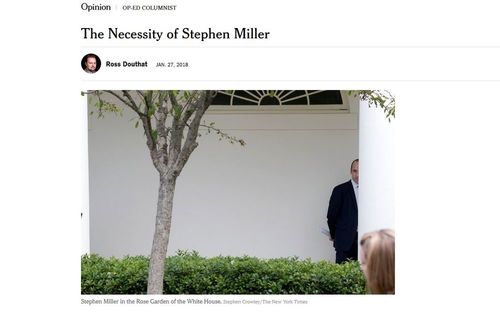 The Necessity of Stephen MillerWell, you can’t get much more moderate than that, right? But lots of people are outraged at Douthat, that notorious racist, for suggesting that Miller, that renegade Jew, should be allowed to advise his boss, the President, a reprllent filth. For example, here’s the most popular comment in response to Ross on the NYT:Ross Douthat JAN. 27, 2018