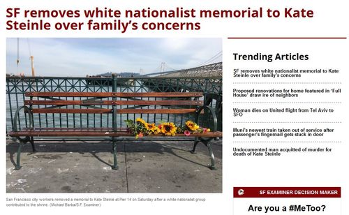 SF removes white nationalist memorial to Kate Steinle over family’s concernEmphasis mine.By Michael Barba on December 2, 2017 1:03 pm