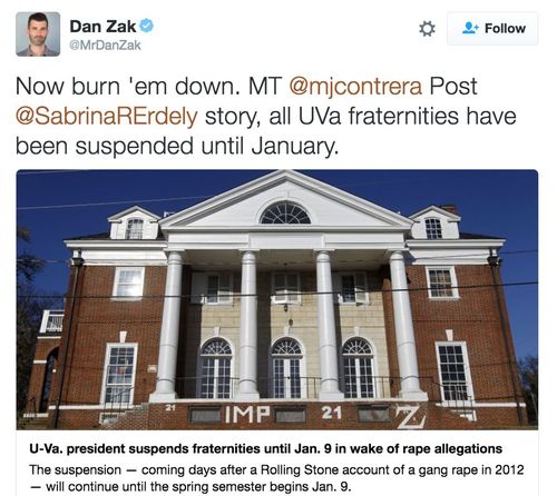 Dan Zak is a Washington Post reporter. It wasn’t good enough for him that one fraternity was subject to a Night of Broken Glass mob breaking its windows and all fraternities on campus were shut. He tweeted: “Now burn ‘em down.”