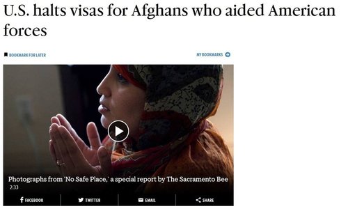 U.S. halts visas for Afghans who aided American forces, Sacramento Bee, March 15, 2017Afghans who aided U.S. forces fighting the Taliban can no longer receive special visas for their service, at least until year’s end, said U.S. senators and advocates who are trying to pass legislation to restart the flow of newcomers.