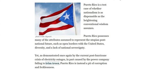 Yet, as demonstrated once again by the current post-hurricane crisis of electricity outages, in part caused by the power company failing to trim trees, Puerto Rico is instead a pit of corruption and fecklessness.