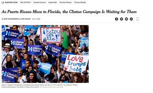 From the perspective of the Hillary Clinton campaign, however, the emptying out of Puerto Rico into Orlando, which is now a “de facto San Juan suburb,” is a feature, not a bug, since it helps tip Florida, the Electoral College’s most important purple state, permanently blue.…