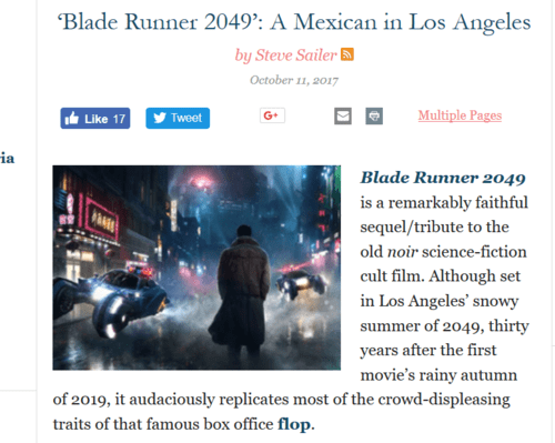The 1982 Blade Runner was also one of the first (and last) sci-fi movies to feature demographic change. Los Angeles in 2019 was overwhelmed by Asian immigrants and everybody had moved back downtown into giant high-rises, two forecasts that seem right on track with two years to go.Read the whole thing there.While the mass immigration and the no-backyards crowding are arriving on schedule, Blade Runner’s flying cars and off-world space colonies, however, are lagging.