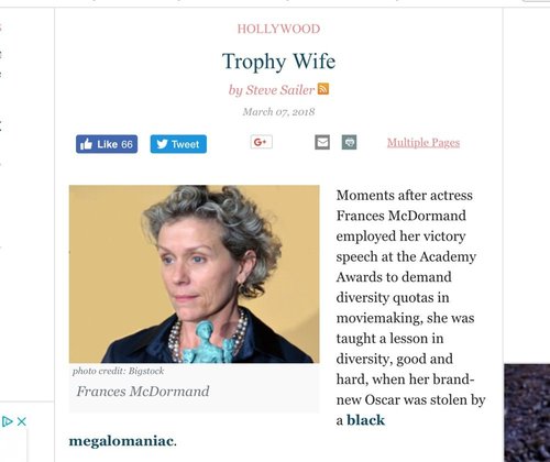 Just before her unfortunate encounter with diversity, McDormand had announced, “I have two words to leave with you tonight, ladies and gentlemen: inclusion rider.” This is a euphemism for stars demanding the imposition of racial and other quotas upon the people working on their movie.For example, Roderick Jaynes, the Oscar-nominated editor of the Coen Brothers’ movies, is not terribly diverse. In fact, technically speaking, Jaynes is not even even a separate and actual human being. Roderick is just Joel and Ethan editing their movies under an assumed name.Like so many famous actresses, Ms. McDormand is not exactly an expert on the nuts and bolts of getting movies made, with the 60-year-old admitting to reporters, “I just found out about this last week.”
