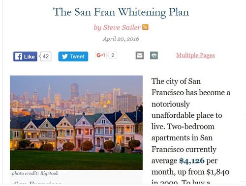 The city of San Francisco has become a notoriously unaffordable place to live. Two-bedroom apartments in San Francisco currently average $4,126 per month, up from $1,840 in 2009. To buy a three-bedroom home would run you $1,612,500.Read the whole thing there.With San Francisco being one of the epicenters of the environmental movement of the past half century, local homeowners are adept at using progressive verbiage for justifying keeping San Francisco in stasis. As a conservative, I rather admire the cleverness with which liberals have contrived to keep San Francisco physically looking much like it did in the past.