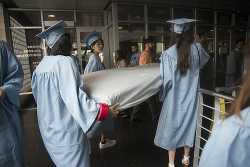 Bringing a mattress to a graduation, in memory of an imaginary crime