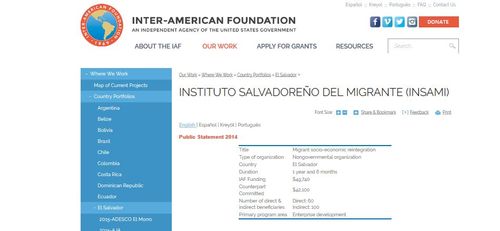 IAF works through a local NGO called INSAMI, which stands for Instituto Salvadoreño del Migrante and which estimates that 500 Salvadorans are deported from the U.S. to El Salvador each week. The group says the IAF funds assist sixty Salvadorans a year, “including deportees,” by helping to “facilitate their reintegration into their communities and support their enterprises.” This is accomplished by “offering financial education, technical advice and assistance with business plans,” all of which serves, in turn, to “assure that broader support and resources are available to the migrants, that their abilities are appreciated, their concerns understood and their needs met.”