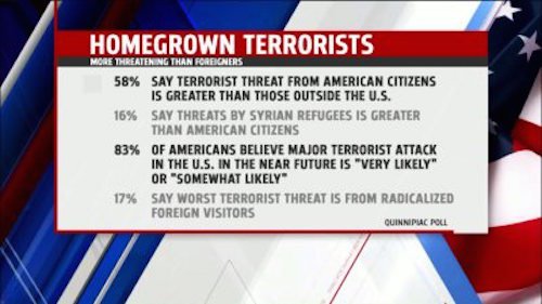 A recent Quinnipiac poll found that 58 percent of Americans thought “homegrown” terror presented the greatest threat to the country’s safety.