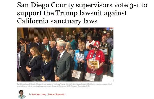 San Diego County supervisors vote 3-1 to support the Trump lawsuit against California sanctuary laws, San Diego Union-Tribune, April 17, 2018The San Diego County Board of Supervisors voted 3-1 to support the Trump administration’s lawsuit against California over laws that the state passed last year to limit its role in immigration enforcement.